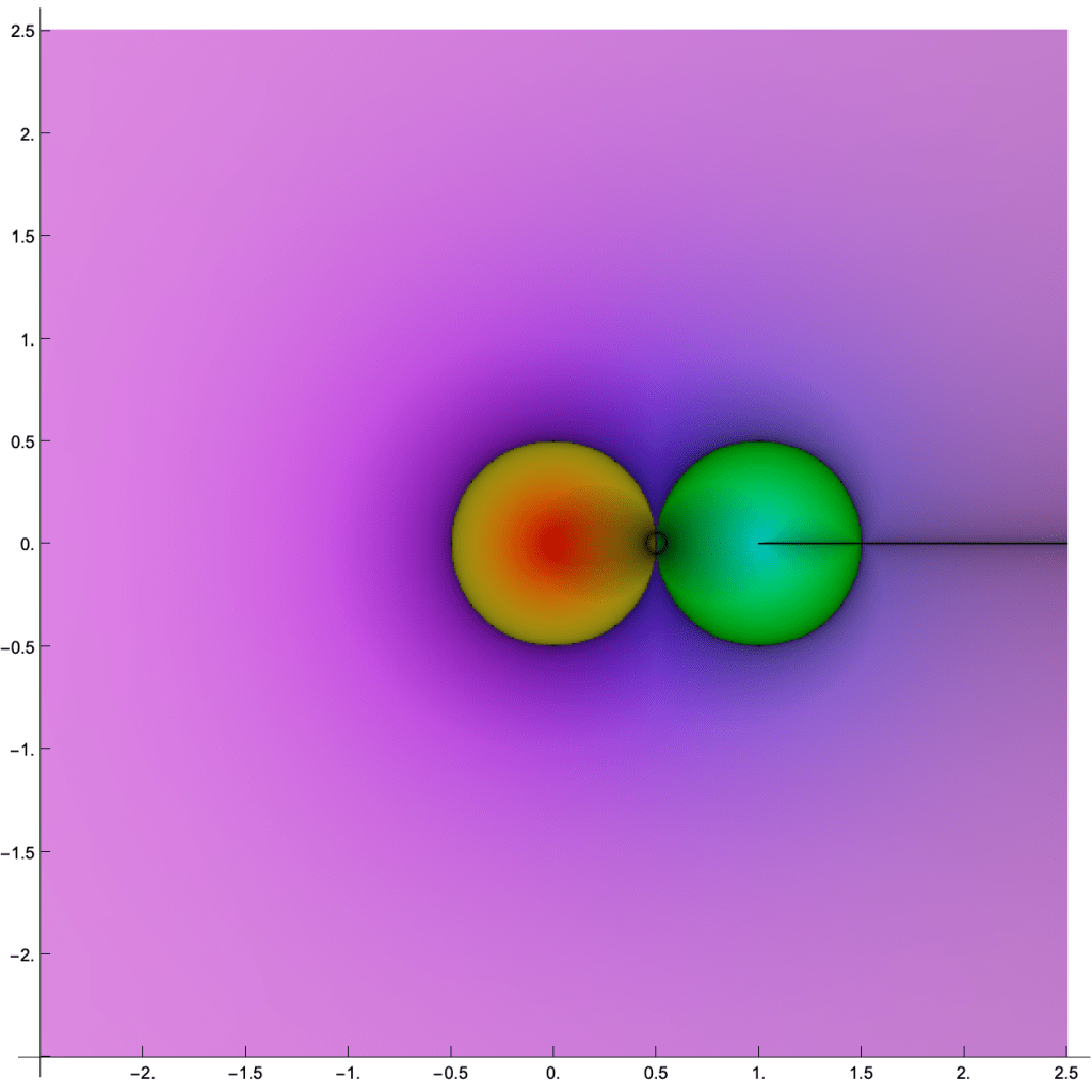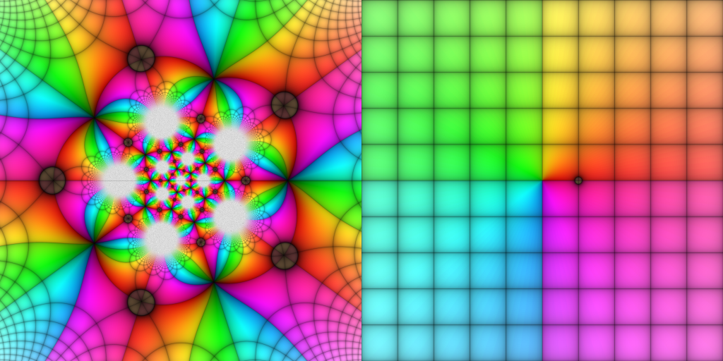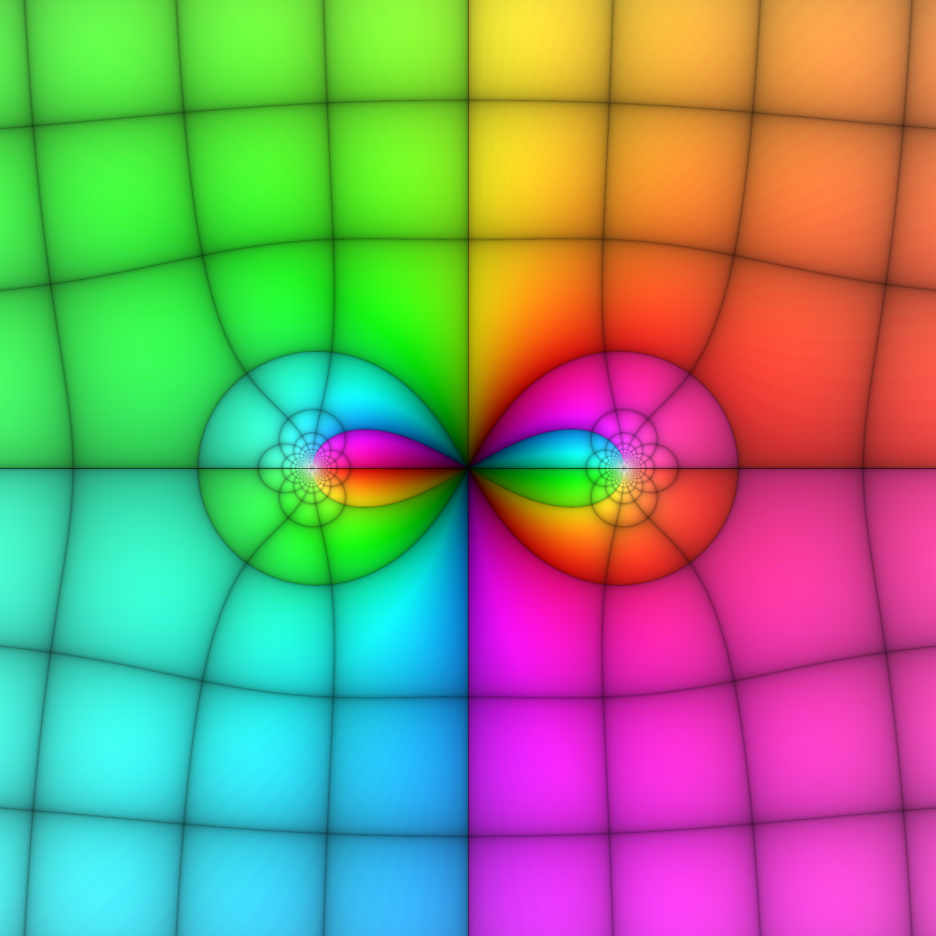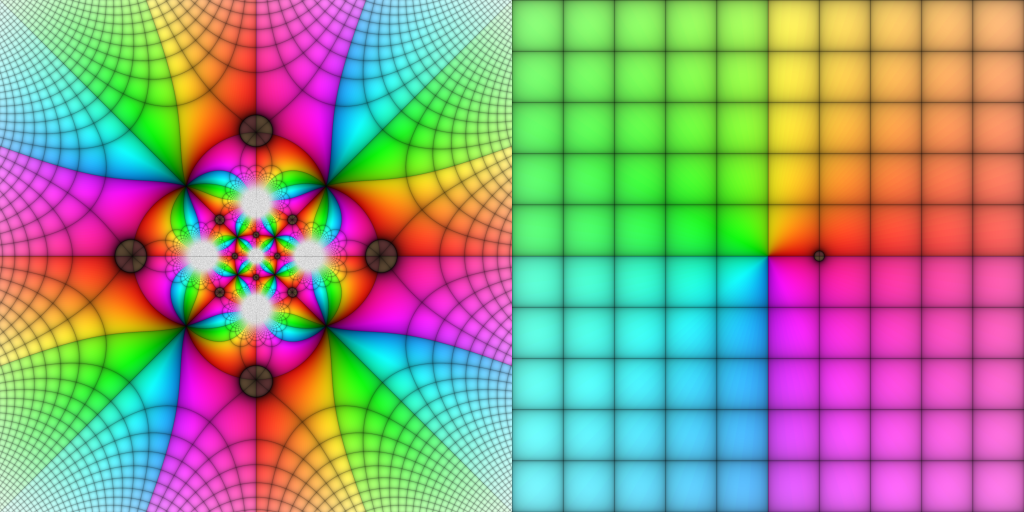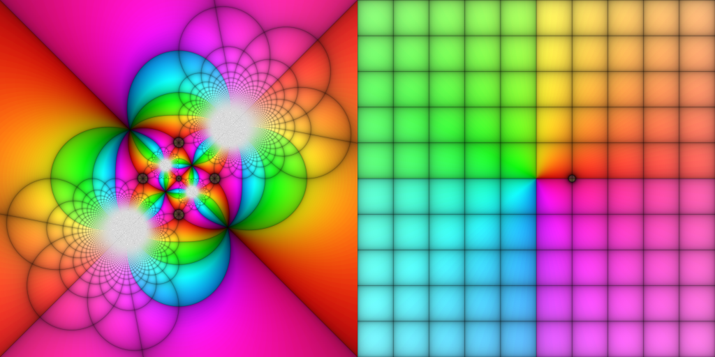 Now, I’m promising that our generalized perspective will grant us more. It’s time for the payoff. Until this point, we’ve used a coloring scheme on the target which allows us to easily see roots and poles of complex functions—when they take the value or