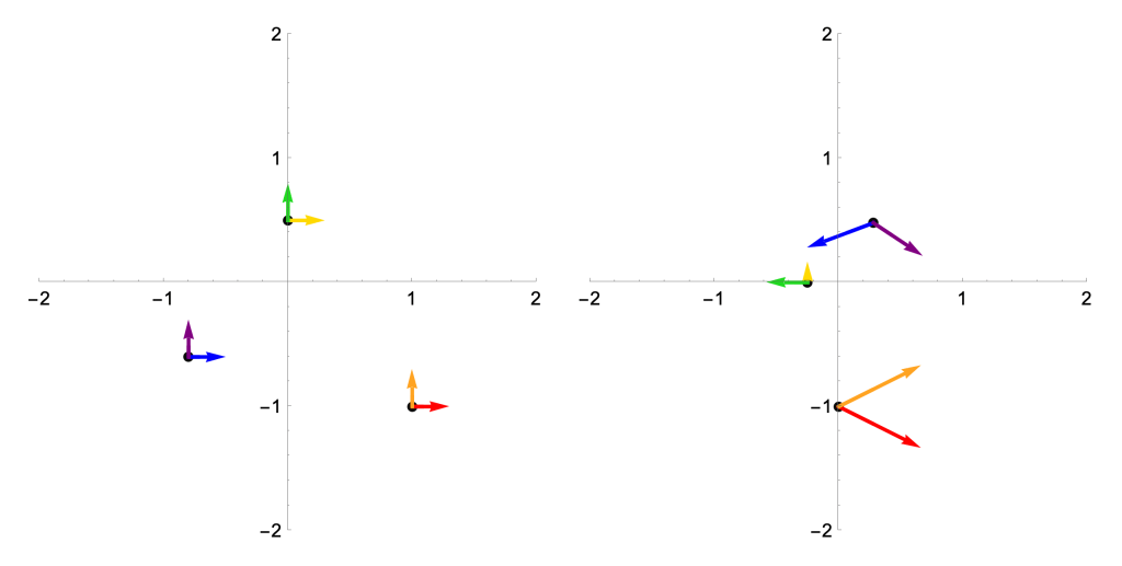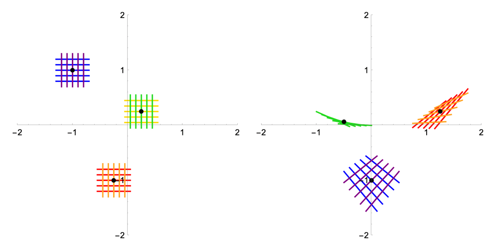 While the picture on the left requires a nontrivial bit of computational power to render—those distortions are non-linear, so drawing the gridlines in the target take some work—we could sketch the one on the right with some pen and paper (and maybe a calculator, since I didn’t pick integer coordinates). That’s the power of calculus! For one last little treat, the determinant of the Jacobian at each of these points (which is zero if and only if the Jacobian is one-to-one, because linear algebra rules) tells us how area is being distorted by . Think about how we might see that in another such image: