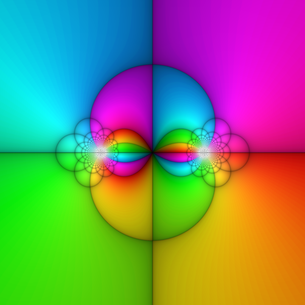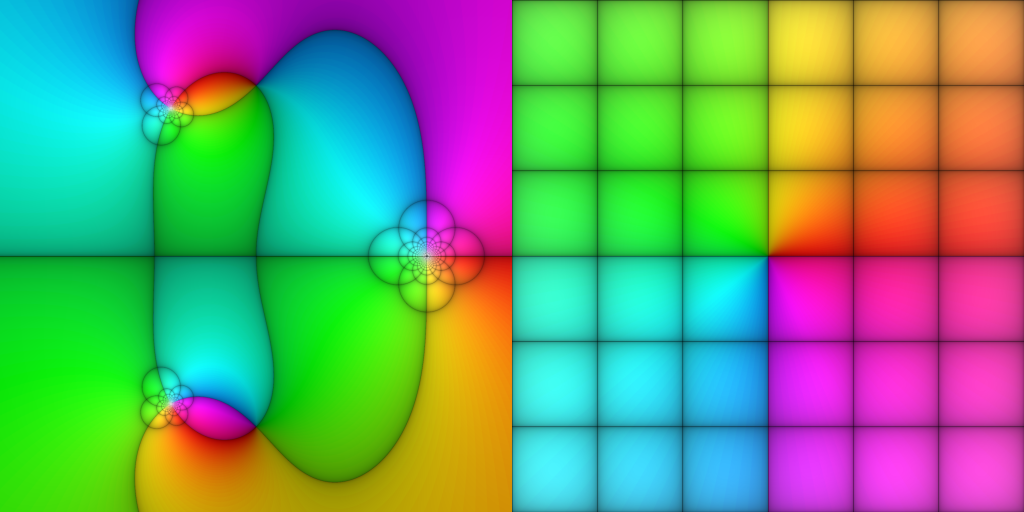 Taking stock, you might be unimpressed by all this. With the target coloring I introduced, we can easily recognize roots (and their multiplicities) for polynomial functions . But, if we look back at the images rendered at the start using